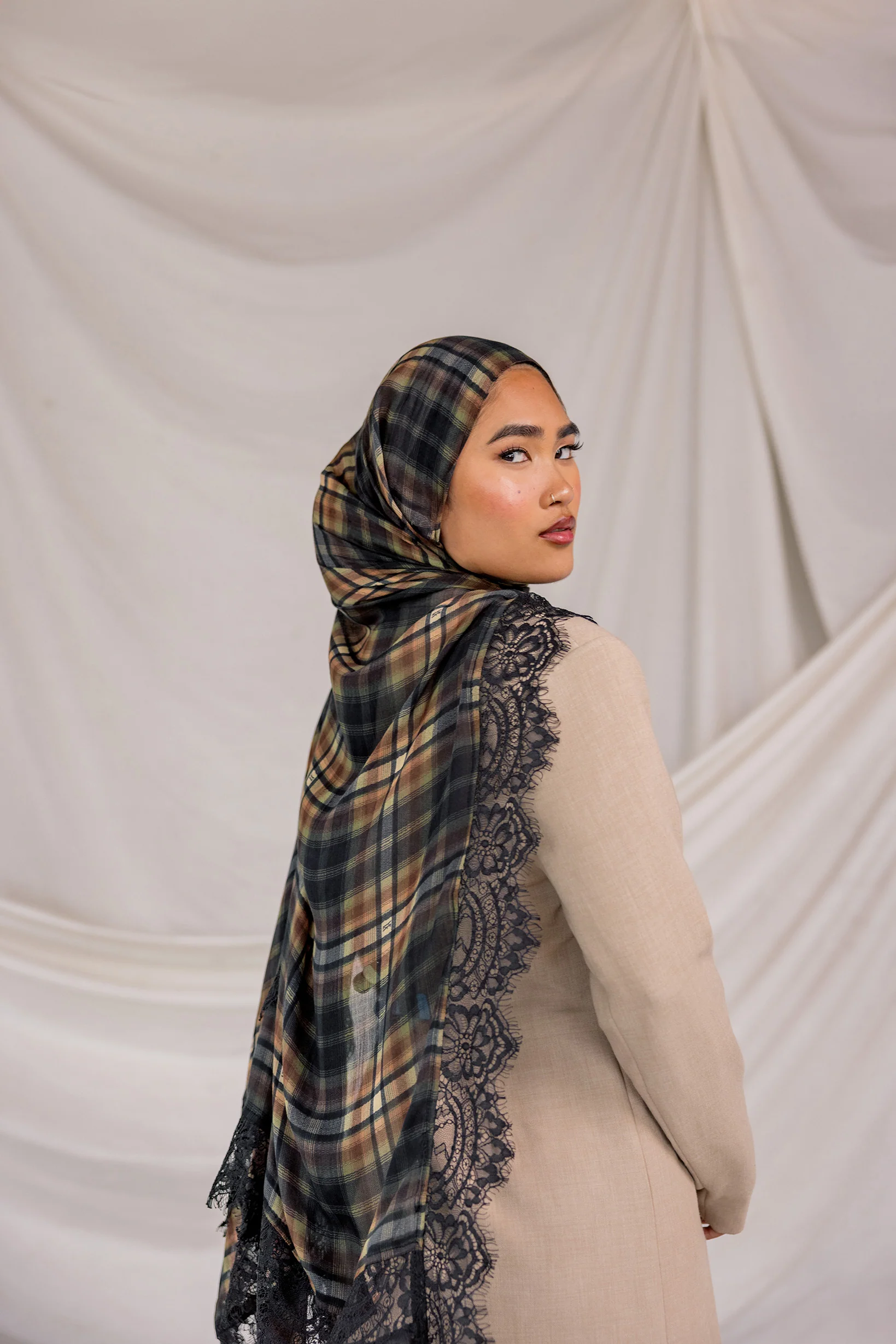 An academic classic reimagined, Black Chantilly Plaid blends timeless check with hand-stitched lace for a touch of heritage romance. Each piece is cut and sewn with intention, a curated process that transforms this plaid into a collector’s hijab. Crafted from our signature lightweight modal fabric, it balances softness with structure – elevated further by the artisanal lacework that makes this design a premium statement in your fall wardrobe.