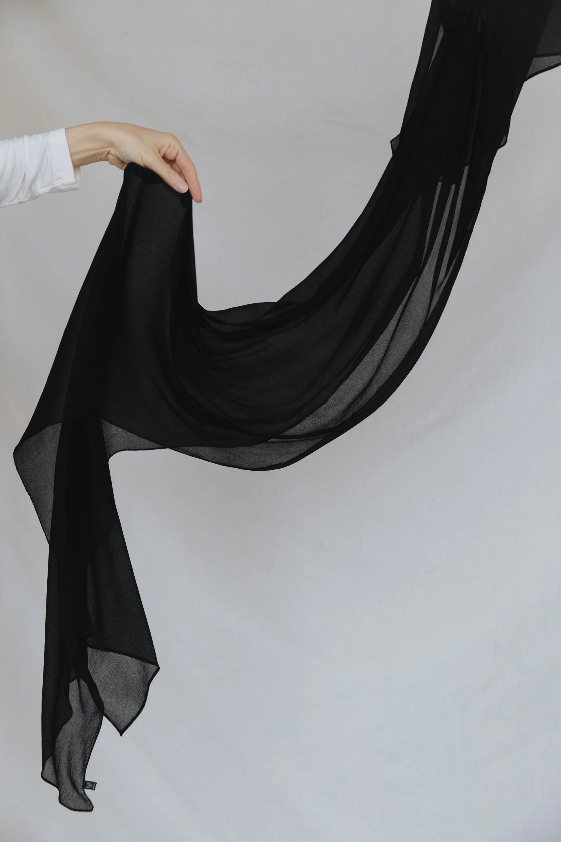 The deep black hijab of your dreams is here. Luxurious natural silk fibers add a touch of sheen to this breathable chiffon fabric. Consider formal events conquered.Ā