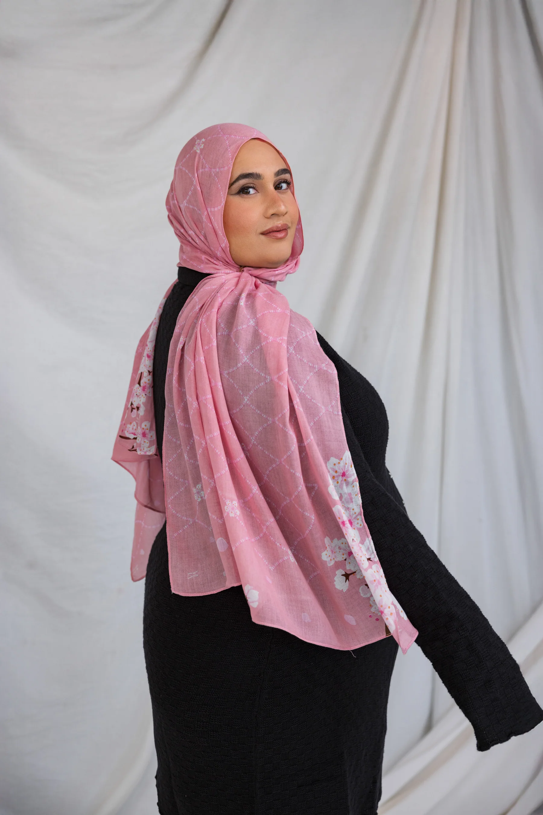 Blush Sakura is a soft, romantic pink inspired by the delicate blooms of cherry blossoms at dawn, a symbol of renewal and beauty during hanami. This gentle, feminine shade embodies the grace of spring as cherry blossoms begin to unfurl their petals, offering a subtle touch of warmth and elegance. Perfect for pairing with any color, it adds a fresh, delicate pop to your wardrobe. Crafted from our signature, butter-soft modal fabric, this hijab offers a dreamy blend of elegance and comfort.Â