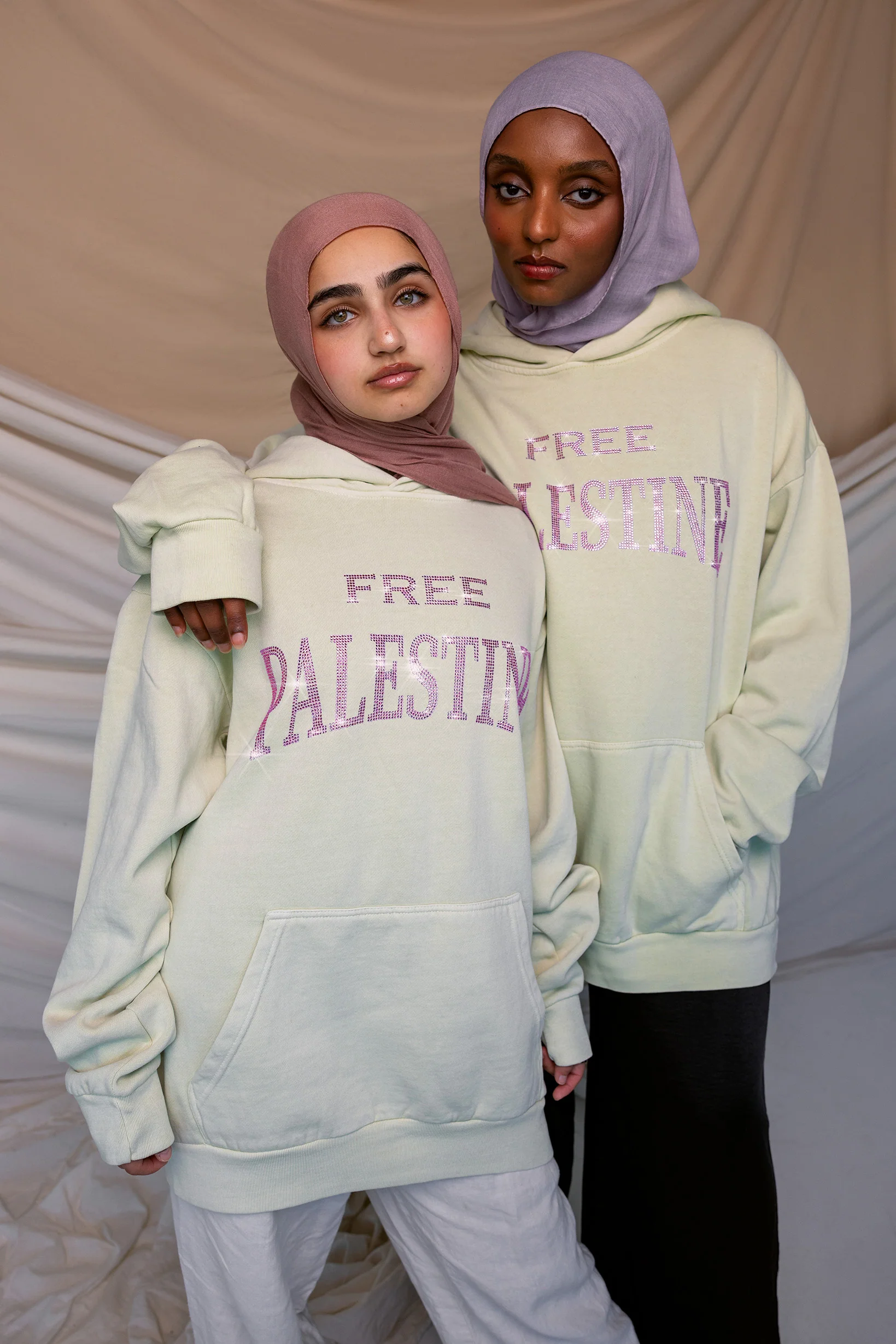 Free Palestine until Palestine is free. This oversized hoodie has Free Palestine emblazoned in statement-making pink rhinestones, on a muted pistachio green canvas.