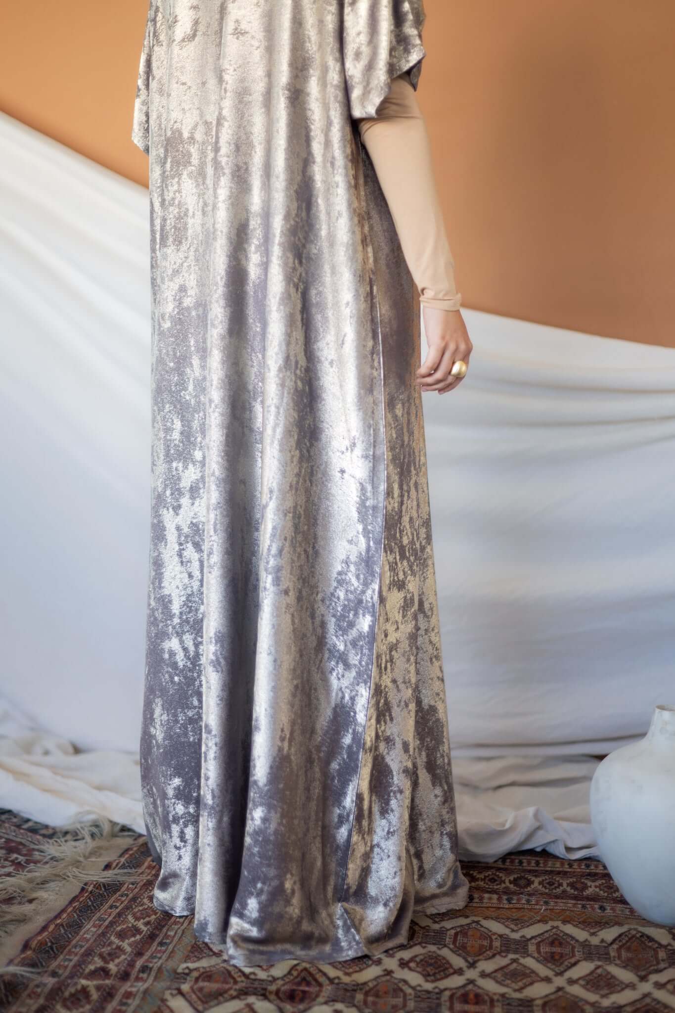 This timeless abaya gives the beautiful illusion of velvet dipped in liquid gold. The material is light and breathable to give a flowing silhouette. This is a 2 piece set and comes with a matching underdress. Pairs well Crescent Phases & Moonlight.