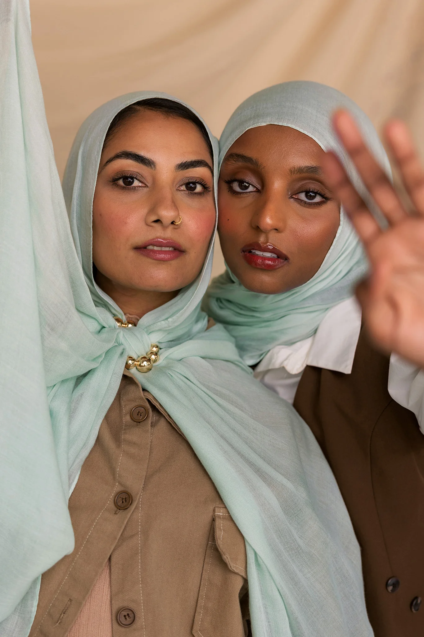 A robin-egg blue sky greets you in this minty refreshing hijab, crafted with our signature woven fabric that cools and flows around you. Don't miss out on our Misty Sky hijab and bring home this soothing shade to elevate your collection. Discover Misty Sky hijab online today.Â