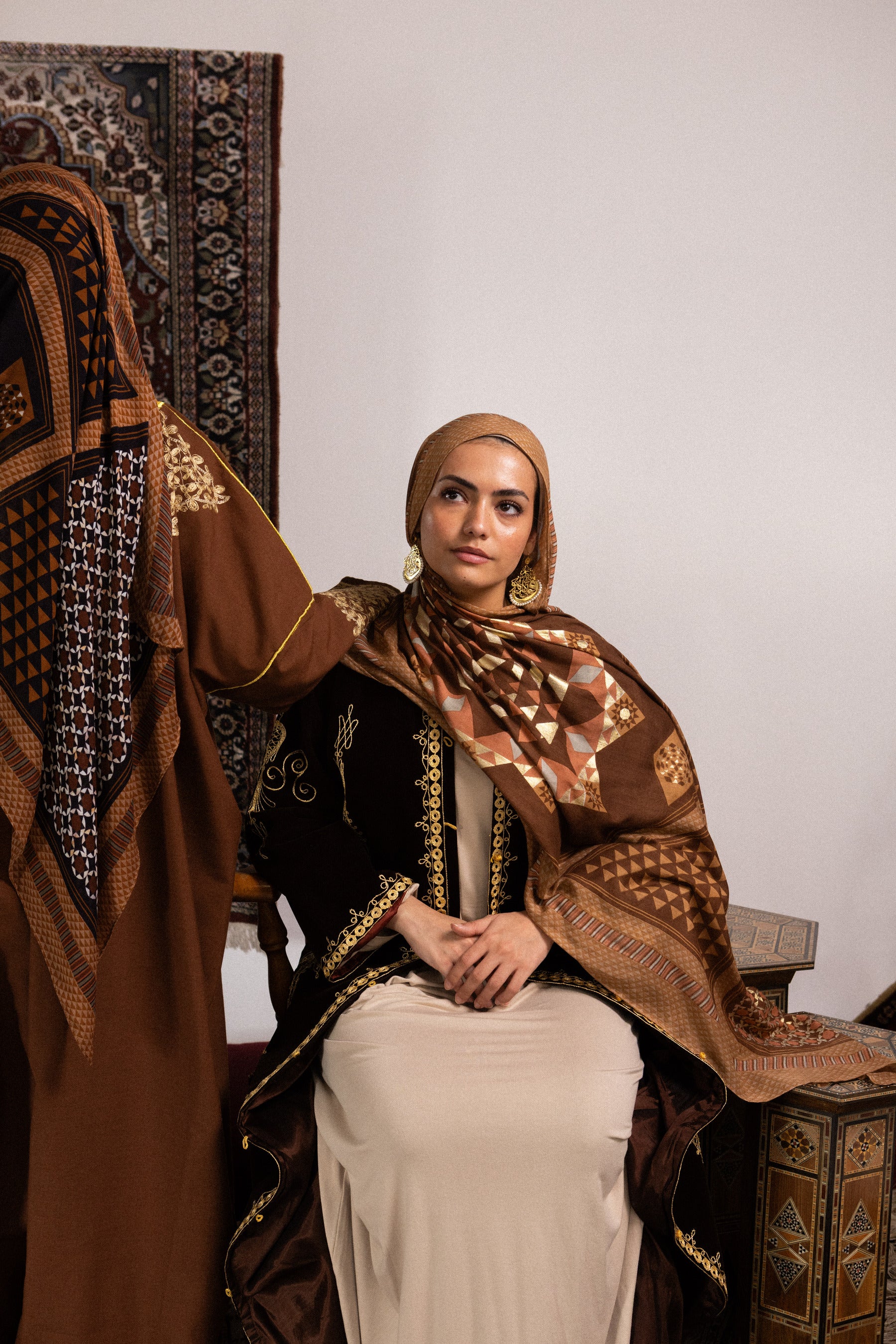 Mosaic Damascene is an ode to Damascus: its stone alleyways, its souks, and the generational artistry that lives in every tile, carving, and color. Designed by Syrian artist Nasreen Atik, the print pieces together the memories she carries from her homeland, honoring the beauty that shaped her identity and still echoes through her work. Hues of tan, rust, and black bring the mosaic patterns to life. Printed on our signature modal fabric, it drapes with ease – a mosaic of memory you can wrap yourself in.