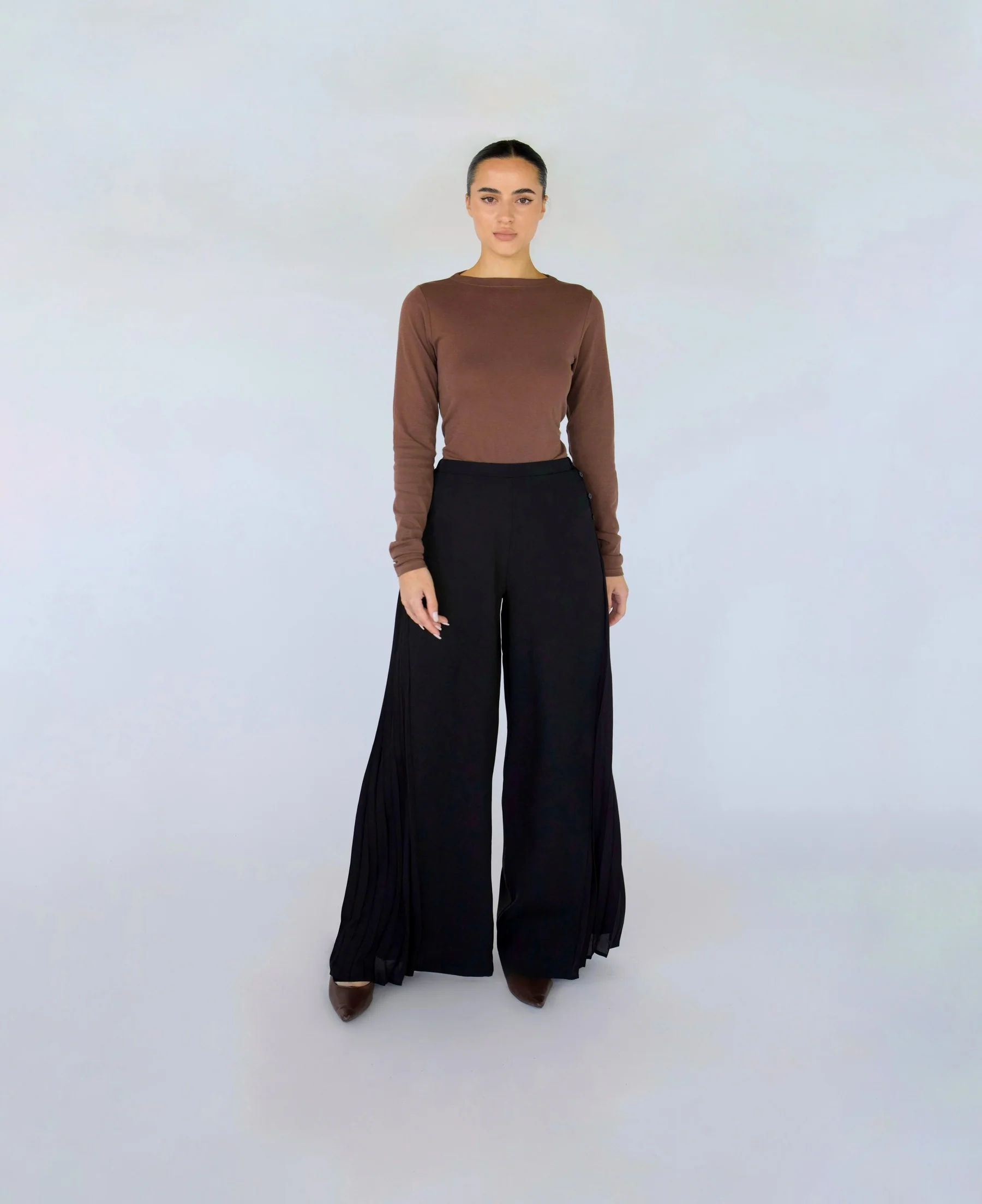 Tailored pleats meet soft chiffon detailing for a polished yet relaxed look. These contrast chiffon pants move with you while maintaining form. These Pleated Self Contrast Pant Black are women’s black pleated pants, designed as stylish black contrast detail trousers and black high waist pleated pants for women. Available in Black in sizes XS–3XL.
