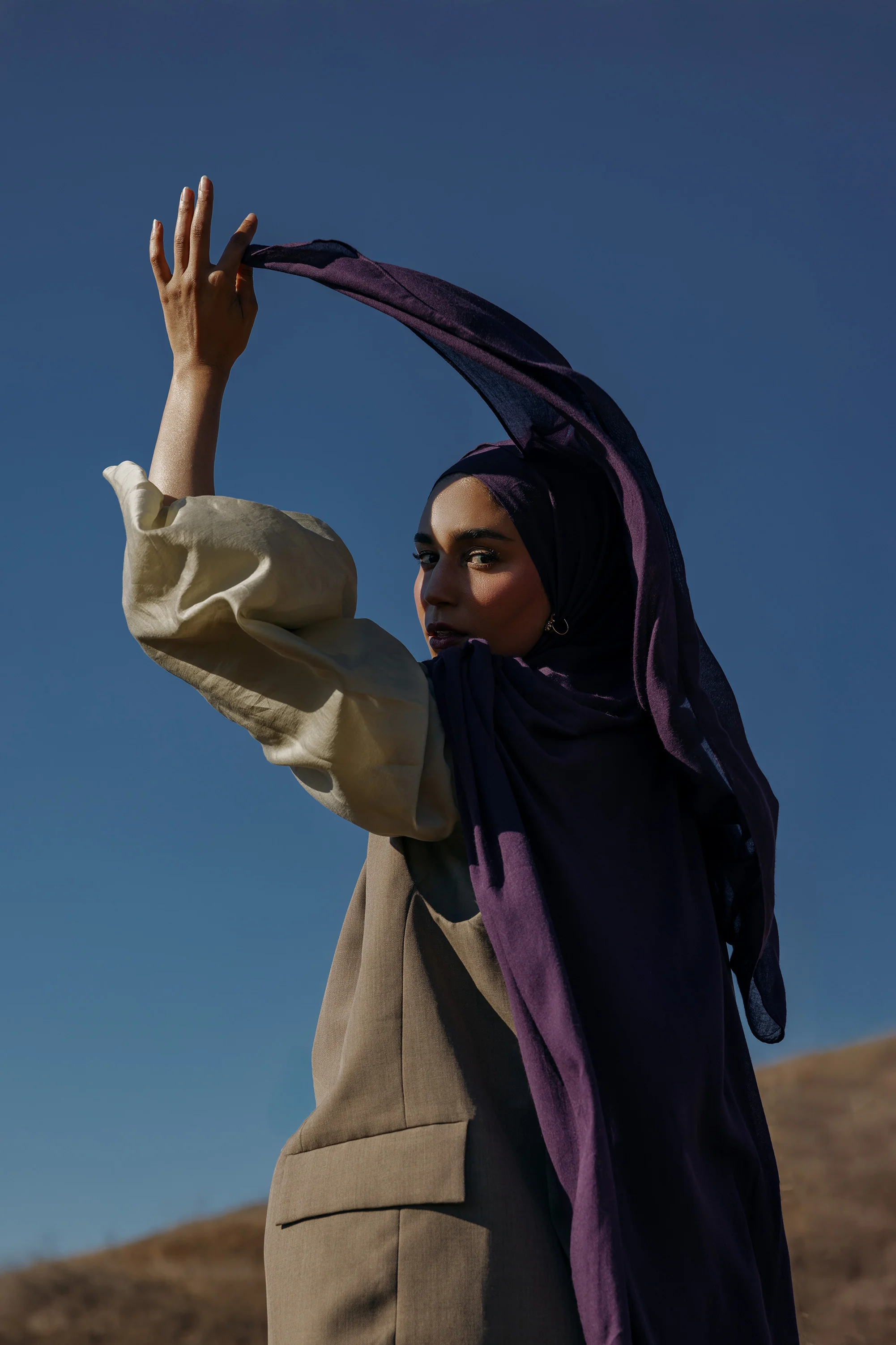Add richness to your fall wardrobe with Pretty Plum in our signature modal fabric. This deep, elegant shade of purple is inspired by the ripened fruits of the season. The woven texture adds a touch of sophistication, while the breathable fabric ensures all-day comfort. Pretty Plum is your go-to hijab for an understated yet striking look that transitions seamlessly from day to night.Â