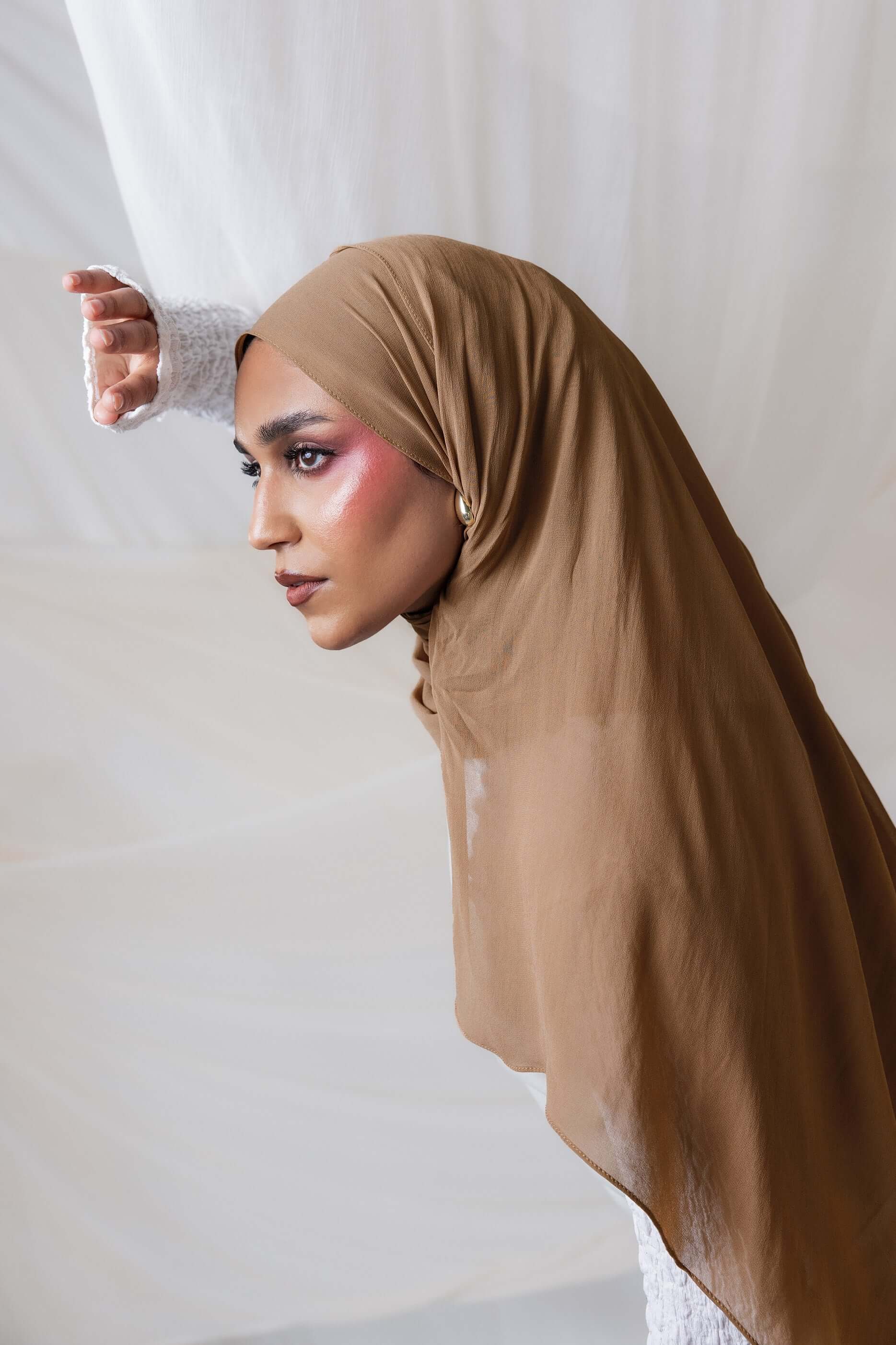 You wonāt be able to get enough of this lustrous golden brown hijab with a neutral undertone. Crafted in cooling, non-slip Crepe Chiffon that has a subtle textured finish made of 100% cotton bemberg. Experience the luxury of our Vela Crepe Chiffon and enjoy the versatility of a Chiffon Hijab. Perfect as a pure chiffon hijab or a silk chiffon hijab for added elegance.Ā