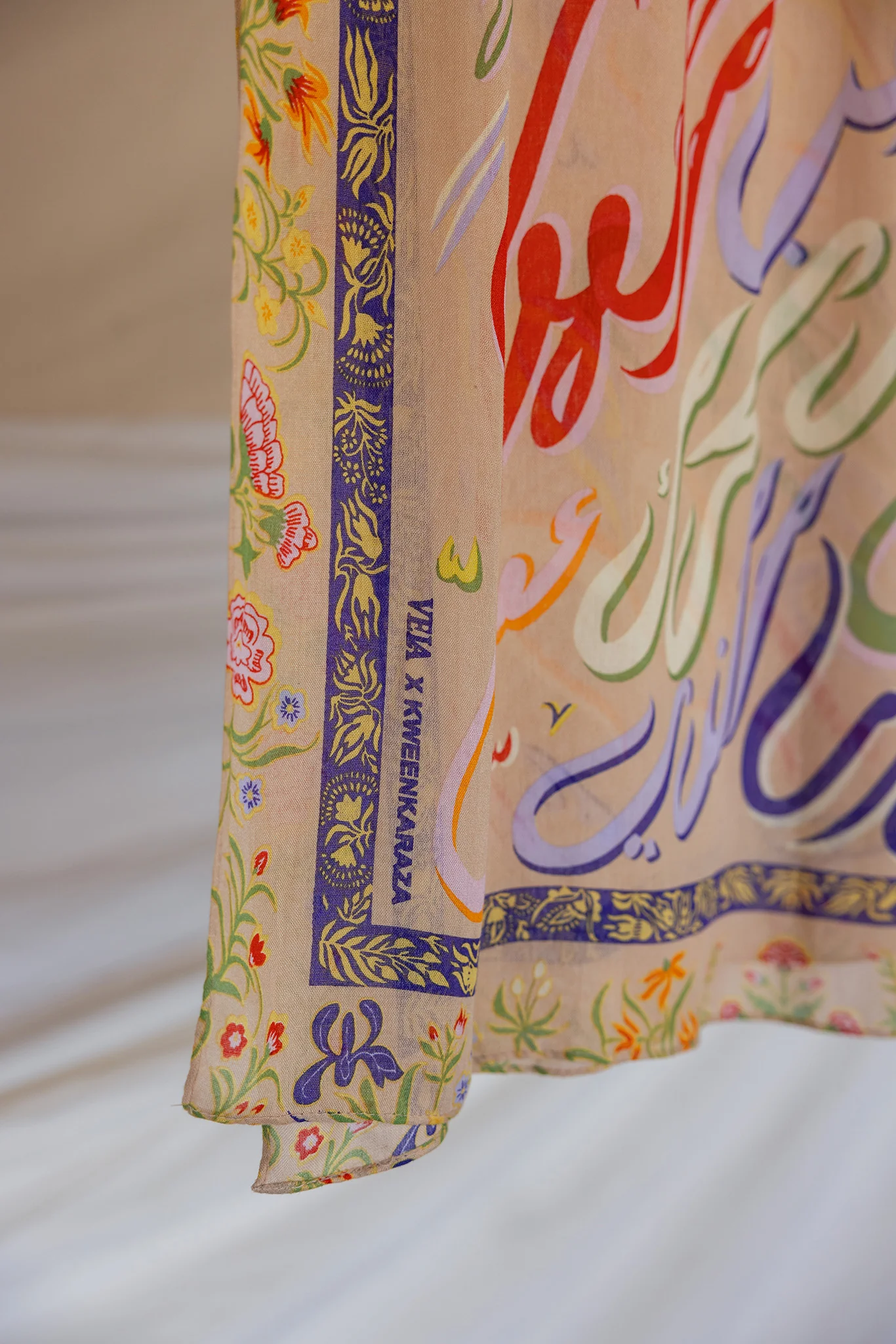 Floral cultural elements and swooping calligraphy make this gorgeous hijab a stunner. Hand-drawn poetry by KweenKaraza captures the heartfelt words of Sufi mystic Rabia Al Basri as she speaks of her love for Allah (swt): āI came to know love the moment I found Your love.ā Woven in cozy modal against a cerulean blue background with a flattering combination of greens and pinks, youāll be amazed at how many fits this hijab will elevate. Discover the Remembrance Beige hijab online and explore its elegance in every style.