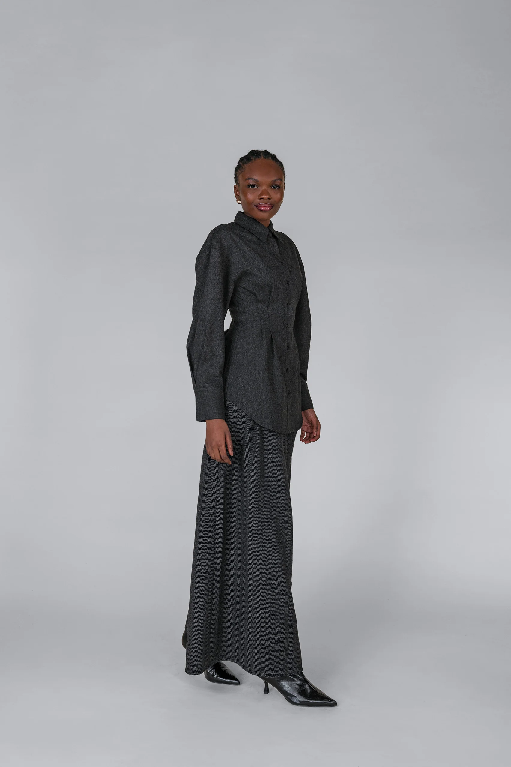 A refined wardrobe essential with tailored shoulders and a crisp silhouette. Woven from 100% polyester herringbone/twill, it blends texture and polish for timeless versatility. Available in Brown, Beige, and Charcoal, XS–3XL. Pair with the matching Herringbone Palazzo Pants. This Sculpted Button Up Charcoal Shirt is a women’s charcoal button up top, designed as an elegant sculpted blouse charcoal and a charcoal long sleeve button up for women.