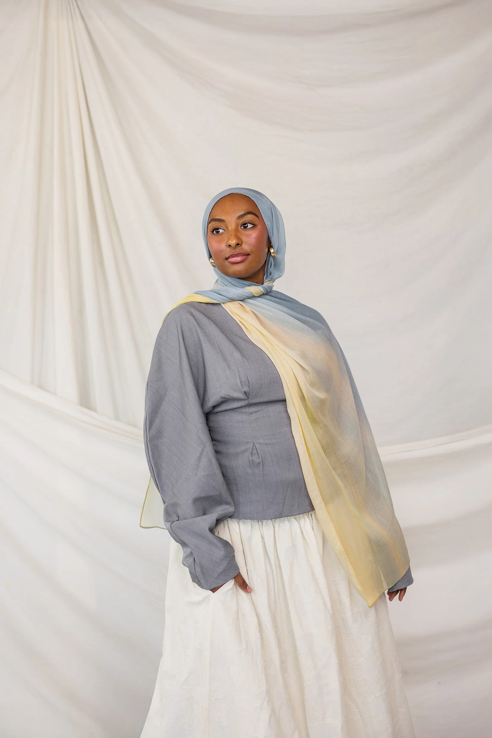 The calm before the sun sets. Sunset Skies blends golden yellow into soft blue, echoing the early evening light that lingers before dusk. Gentle, airy, and endlessly wearable, it’s your golden hour captured on our signature lightweight modal fabric.