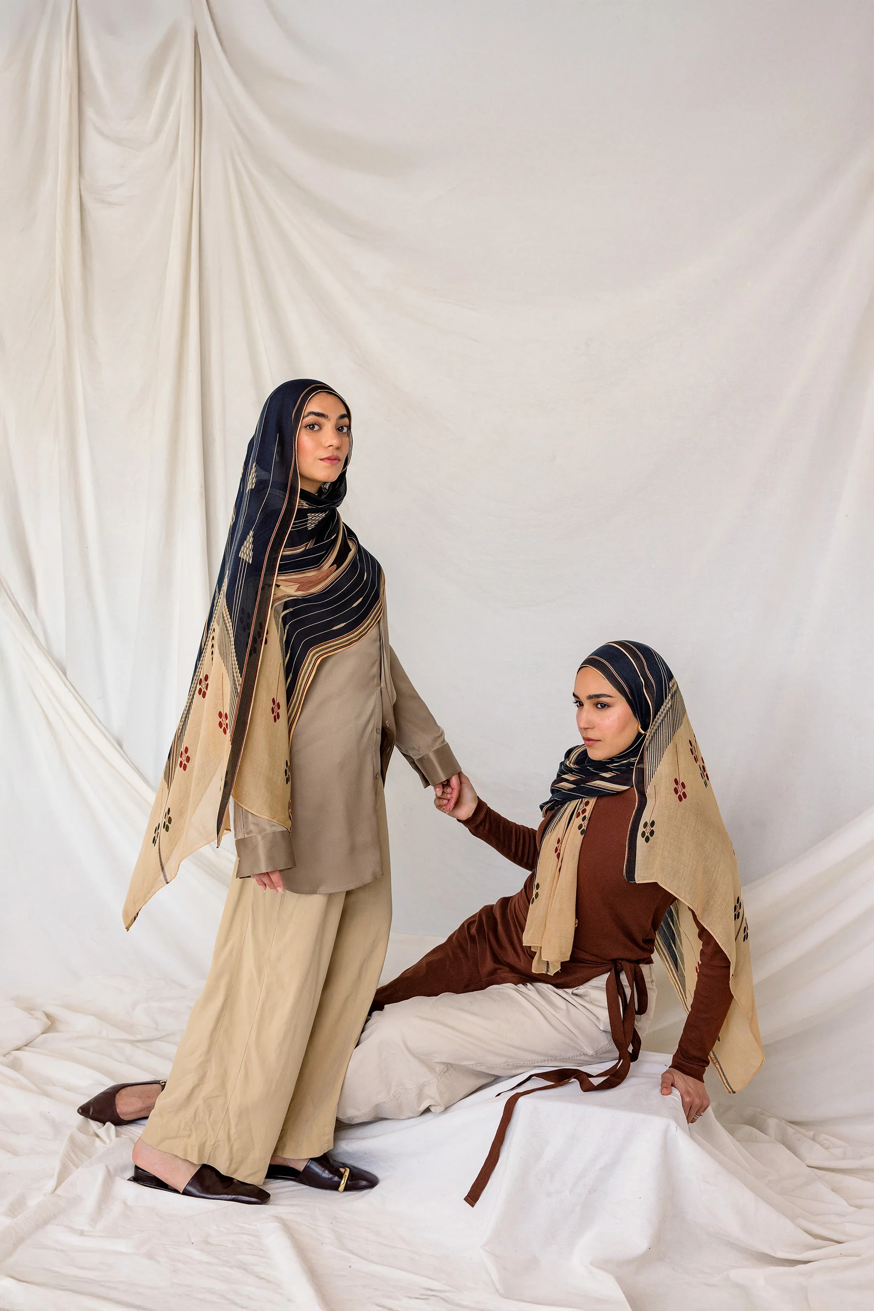 Your beloved Sweida Loom in a new colorway. A print that tells a story of Syrian heritage and craftsmanship. Inspired by a handwoven fabric hailing from Sweida in Southern Syria, which was traditionally used for crafting cushions known as "Dirziyyeh”. With its rich navy and cream tones, you’ll have everyone asking you where your Sweida Floral hijab is from. Discover the beauty of the Sweida Floral hijab.