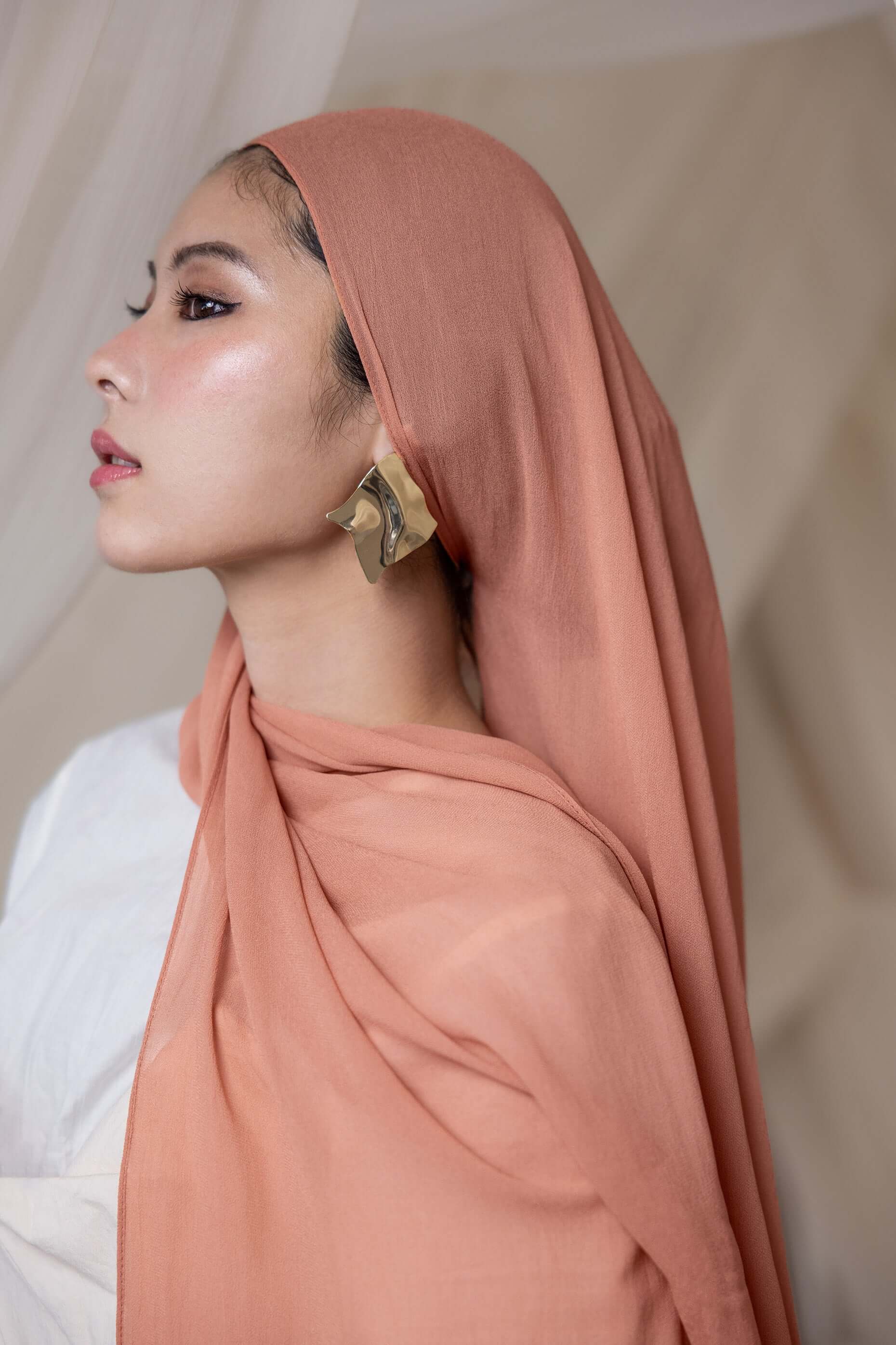 Your new favorite Summer hijab is here. A soft coral in even softer Crepe Chiffon that’s sustainable and made of 100% cotton bemberg. Enjoy the luxurious feel of our Terra Crepe Chiffon fabric. Perfect as a pure chiffon hijab or a stylish chiffon silk scarf for any occasion.Â