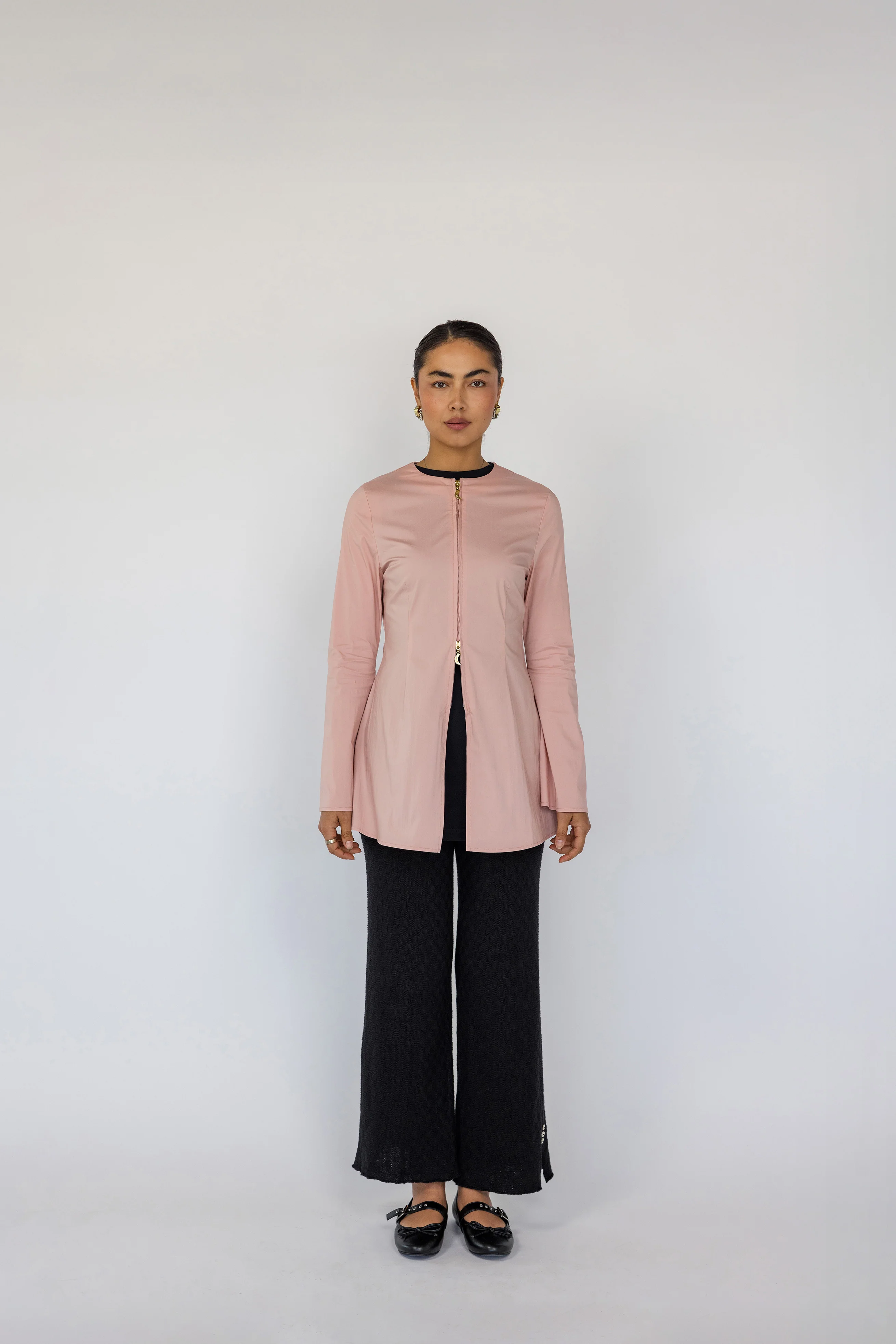 Function meets form in this structured yet breathable zip-up. Designed with dual zippers for styling versatility and crafted from a cotton-nylon-spandex blend, it offers structure without stiffness. A modular layering piece made from a breathable cotton blend, this structured zip-up functions beautifully as a dual zipper top for everyday wear. Layer it open or zip it up for full coverage. Available in Rose and Black, in sizes XS–3XL.