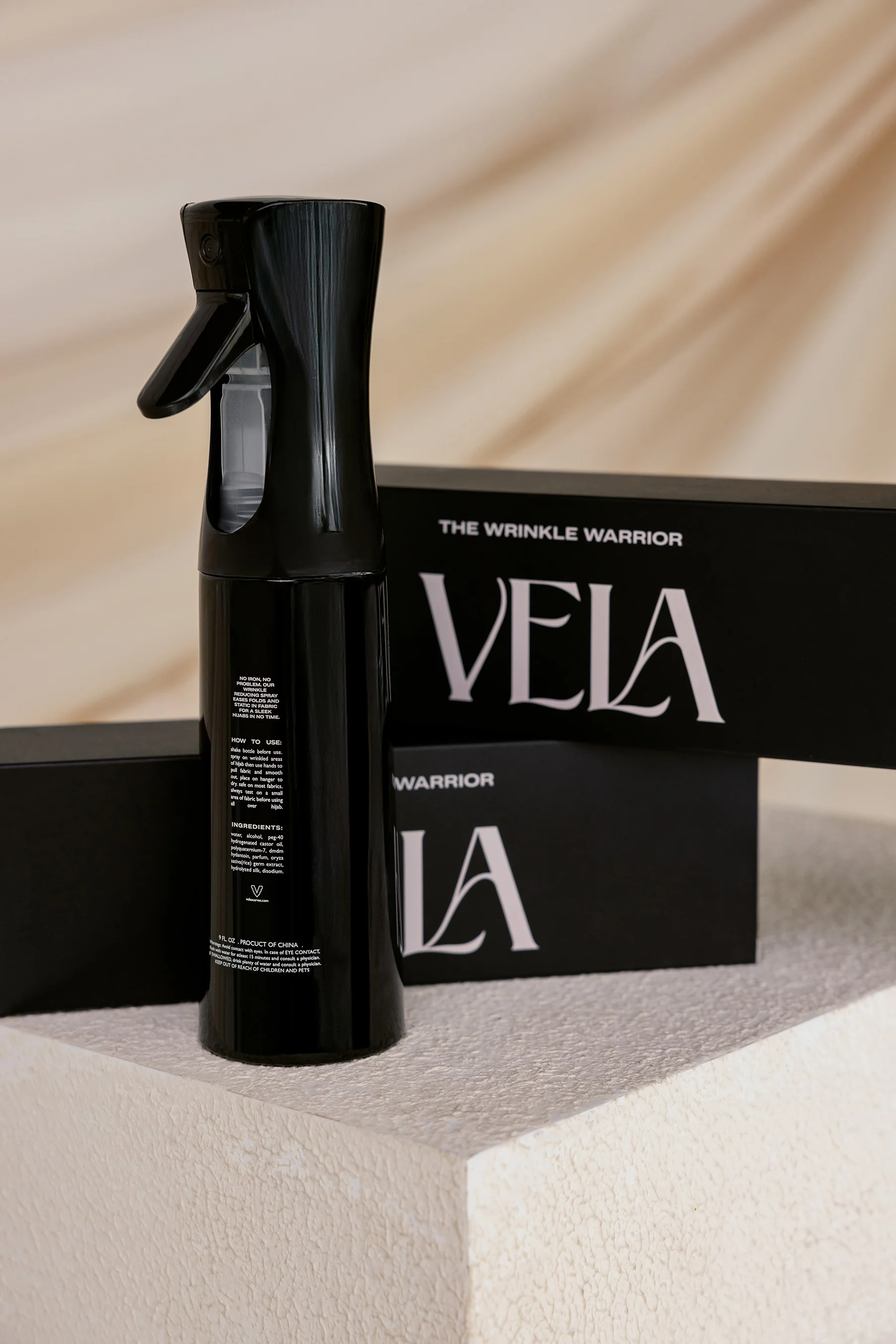 Say goodbye to wrinkles and hello to perfumed hijabs with VELA's 9 oz Wrinkle Warrior. This wrinkle release spray and hijab perfume smooths your hijab and leaves behind a warm, addictive fragrance with notes of wood, musk, and a touch of sweetness. Quick, effortless, and your new hijab essential. It's the perfect travel-friendly fabric freshener, ensuring your hijab stays wrinkle-free and wonderfully scented wherever you go.